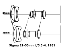 The next landmark zoom was the Sigma 21-35mm f/3.5-4 (Japan) of 1981. It was the first super-wide angle zoom lens for still cameras (most 35mm SLRs). Previously, combining the complexities of rectilinear super-wide angle lenses, retrofocus lenses and zoom lenses seemed impossible. The Sigma's all-moving eleven element/seven group/three cell formula was a triumph of computer-aided design and multicoating.[115]