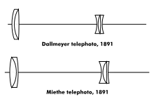 In 1891, Thomas Dallmeyer and Adolf Miethe simultaneously attempted to patent new lens designs with nearly identical formulae – complete photographic telephoto lenses consisting of a front achromat doublet and rear achromat triplet. Primacy was never established and no patent was ever granted for the first telephoto lens.[1]: 133–134