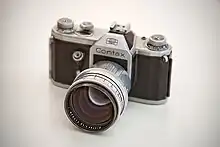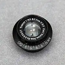 However, the Kilfitt Makro-Kilar 4 cm f/3.5 (West Germany/Liechtenstein) of 1955 for Exakta 35mm SLRs changed the everyday meaning of macro lens.[80] It was the first lens to provide continuous close focusing. Version D of Heinz Kilfitt's (West Germany) Makro-Kilar focused from infinity to 1:1 ratio (life-size) at two inches; version E, to 1:2 ratio (half life-size) at four inches.[81] The Makro-Kilar was a Tessar mounted in an extra long draw triple helical. SLR cameras were best for macro lenses because SLRs do not suffer from viewfinder parallax error at very close focus distances.[82]