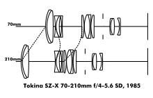 Convenience of a different sort was the major feature of the Tokina SZ-X 70-210mm f/4-5.6 SD (Japan) of 1985. It was the first ultra-compact zoom (85×66 mm, 445 g, 52mm filter); half the size of most earlier 70-210 zooms[126] (the third generation Vivitar Series 1 70-210mm f/2.8-4 [1984, USA/Japan] was 139×70 mm, 860 g, 62mm filter).[127] Like the Kiron 28-210mm, the twelve element/eight group/three cell Tokina had a small variable maximum aperture, but added low dispersion glass and a new bidirectional nonlinear zooming action, to bring size and weight down to an absolute minimum.[128]