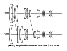 The first zoom lens for still cameras was the Voigtländer-Zoomar 36-82mm f/2.8 (USA/West Germany) of 1959,[98] for Voigtländer Bessamatic series (1959, West Germany) 35mm leaf shutter SLRs.[99] It was designed by Zoomar in the United States and manufactured by Kilfitt in West Germany for Voigtländer.[100] The Zoomar 36-82 was very large and heavy for the focal length[101] – 95mm filter size.[102]