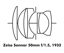 Bertele continued Ernostar development under the more famous Sonnar name after Ernemann was absorbed by Zeiss in 1926. He reached f/1.5 in 1932 with the Zeiss Sonnar 50mm f/1.5[47][48] for the Contax I 35mm rangefinder camera (1932, Germany).[49]
