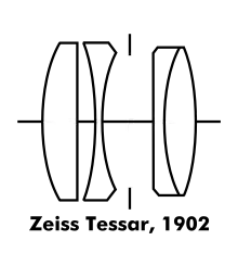 It is often incorrectly stated that the Leitz Elmar 50mm f/3.5 fixed to the Leica A (1925, Germany), Leitz's first camera, was a Tessar.[42] However, at the time the Leica was introduced the 50mm f/3.5 Kino Tessar had only been designed to cover the cine format of 18x24mm, which was insufficient for the new 24x36mm format of the Leica, and Leitz had to develop a new lens to provide adequate full frame coverage. It was only when Zeiss Ikon were designing the Contax in response to the success of the Leica that a 50mm Tessar which could cover the 24x36mm format was designed. The Elmar was based on a modified Cooke Triplet with a different computation to the Tessar and with the stop in the first air space.[43]