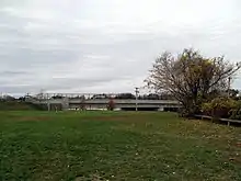 During the 1980s, the Dedham Corporate Center office park was built nearby due to convenient access to Route 128 and Route 1. On January 15, 1990, Dedham Corporate Center station was opened just off exit 14 of Interstate 95/Route 128, near the old Dedham Junction and Rustcraft stations.[19] As well as providing access to the office park, the station provides nearly 500 parking spaces for commuters riding to Boston, as well as access to the office park for workers coming from both directions on the line. The station consists of two platforms (each a long low asphalt platform with a short high-level platform for handicapped accessibility) serving the Franklin/Foxboro Line's two tracks. Original plans called for a much larger "transportation center" on the site, including a 1,000 car garage on Rustcraft Road, but town officials were opposed.[20]
