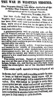 When the Indiana and Ohio state troops under command of Gen. George B. McClellan invaded West Virginia on May 26, 1861, Gen. McClellan issued a proclamation "To the Union Men of Western Virginia" in which he stated "Notwithstanding all that has been said by the traitors to induce you to believe that our advent among you will be signalized by interference with your slaves, understand one thing clearly—not only will we abstain from all such interference, but we will, on the contrary, with an iron hand, crush any attempt at insurrection on their part."[72] Writing in his journal on January 3, 1862 in Fayetteville future president Col. Rutherford B. Hayes noted, "Nobody in this army thinks of giving to the Rebels their fugitive slaves. Union men might perhaps be differently dealt with-probably would be."[73]