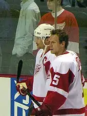 Steve Yzerman with Nicklas Lidstrom during the 2005–06. The season would be Yzerman's last, with Lidstrom succeeding him as the team captain.