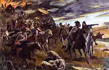 According to Jordanes, Attila's death precipitated a power struggle between his sons – it is unknown how many there were in total, but ancient sources mention three by name: Ellac, Dengizich and Ernak.[149] The brothers began fighting one another, and this caused the Gepids under Ardaric to rebel. The Huns under Ellac then fought the Gepids and were defeated, resulting in Ellac's death.[150] According to Jordanes, this occurred at the Battle of Nedao in 454, however, Heather speculates that there may have been more than just a single battle.[150] Some tribes, such as the Sciri, fought on the Huns' side against the Gepids.[151] He also notes that, while 454 may have been a significant turning point, it by no means ended Hunnic rule over most of their subject peoples.[152] According to Heather, rather than an immediate collapse, the end of Hunnic rule was a slow process whereby the Huns gradually lost control over their subject peoples.[153]