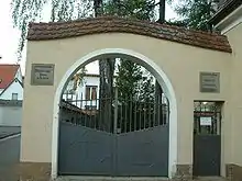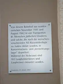 As a result of the accelerated discrimination of Jews, emigration from Laupheim increased to 32 in 1939. In 1940, only 14 persons managed to escape the oppression and in 1941 a meagre 4 Jews from Laupheim managed to leave the country.[52] Those remaining were, after having been driven out of business, systematically deprived of their other properties, evicted and allocated alternative accommodation. Some were moved into the former Rabbi's office building, now turned into a Jewish retirement home, where living conditions were very crammed. Others were sent to live in the Wendelinsgrube, a designated settlement area in a gravel pit just outside the then built-up area of Laupheim, where since 1927 small houses had been erected to provide accommodation for the unemployed and homeless. By 1939 these houses consisted of wooden shacks without running water or electricity. The former residents of the Wendelinsgrube moved into the forcibly abandoned Jewish properties.[53] On 28 November 1941, the first transport of Laupheim Jews left, in the first instance to Stuttgart, and then onwards to Riga. The second wave of deportations took place on 25 March 1942, when a number of Laupheim Jews were transported to the General Government, Poland. The final deportation took place on 19 August 1942, when the remaining 43 Jews of Laupheim, amongst whom were all the remaining inhabitants of the Wendelinsgrube, were transported to the east to the concentration camp Theresienstadt.[49] This date marks the end of more than 200 years of Jewish history in Laupheim since none of the emigrants or surviving deportees returned to live in Laupheim.