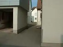 The settlement of the Jews in Laupheim developed on the so-called Judenberg ("Jews’ mountain" or rather "Jews’ hill") with the Judengasse ("Jews’ Lane") at its centre, a ghetto-like area, separated from the rest of the town, yet in close proximity to the market square. The Judenberg forms a regular square where the 8 oldest houses, arranged in 3 rows, are positioned parallel to one of the main streets leading away from the town centre.[10] The local Jews were allowed to influence the planning and design of their houses from the end of the 18th century onwards. It is remarkable, even today, that all houses are approachable from the front as well as the back, and that even the front yards and front gardens are not fenced in. The reason for this lies in the fact that the Judengasse was meant to incorporate the whole Jewish settlement to form an eruv.[19]