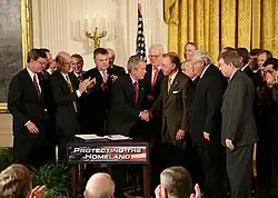 The House responded on September 11 that they unanimously disagreed with the Senate amendment, and agreed to a conference. They then attempted to make a number of changes to the bill however it was not enough for Republican senators Larry Craig, John Sununu and Lisa Murkowski, and Democratic senators Dick Durbin, Russ Feingold and Ken Salazar, who wrote a letter threatening to block the bill if further changes were not made.[109] The House duly proposed a House report, which was incorporated into a Conference report, which was then presented to the Senate. However, the Senate rejected the report, and on December 16 refused to end debate on legislation to renew the Act. A cloture motion was then ordered, but it failed, having fallen seven votes short of invoking closure on the matter, leaving the future of the Act in doubt. The vote went as follows: Fifty Republicans as well as two Democrats voted unsuccessfully to end debate; Five Republicans, 41 Democrats and one independent voted to block.[110] With the sunsets threatening to expire, on December 21 the U.S. Senate came to a bipartisan agreement (S.2167) to extend by six months the expiring provisions of the Act.[111] Under House rules, the House Judiciary Committee Chairman James Sensenbrenner had the authority to block enactment of the six-month extension. On the following day, the House rejected the six-month extension and voted for a one-month extension,[112] which the Senate subsequently approved later that night.[113] However, on February 1, the House voted to again extend the sunsets to March 10.[114][115][116][117] The reauthorization Act was finally passed on March 2 by the Senate with a vote of 95–4, though this was opposed by Senator Feingold who unsuccessfully attempted to extend the sunsets.[118] The House voted 280–138 in favour of authorizing the Act.[119] Finally, on March 8, President Bush signed the reauthorization Act,[120] declaring that "The Patriot Act has served America well, yet we cannot let the fact that America has not been attacked since September the 11th lull us into the illusion that the terrorist threat has disappeared" and that the White House would "continue to give [military law enforcement, homeland security and intelligence professionals] the tools to get the job done."[121] However, after the ceremony, he issued a signing statement that "The executive branch shall construe the provisions of H.R. 3199 that call for furnishing information to entities outside the executive branch, such as sections 106A and 119, in a manner consistent with the President's constitutional authority to supervise the unitary executive branch and to withhold information the disclosure of which could impair foreign relations, national security, the deliberative processes of the Executive, or the performance of the Executive's constitutional duties"[122] — in other words, he would not feel bound to comply with some of the provisions of the law if they conflicted with other Constitutional laws.[123] This immediately drew a sharp rebuke from Senator Leahy, who condemned the statement as "nothing short of a radical effort to re-shape the constitutional separation of powers and evade accountability and responsibility for following the law ... The President's signing statements are not the law, and we should not allow them to be the last word. The President's constitutional duty is to faithfully execute the laws as written by the Congress. It is our duty to ensure, by means of congressional oversight, that he does so."[124][125]