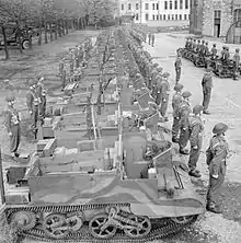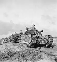 Back in July 1944, the 3rd (Tank) Battalion landed in France, with heavy fighting still raging in the Normandy area. The battalion saw action at Mont Pincon, where at Quarry Hill, a squadron of the battalion was ambushed by three 8.8 cm armed Jagdpanther tank destroyers, who duly accounted for eleven Churchill tanks of the battalion who eventually forced the Germans to withdraw. The battalion saw further service taking part in the steady Allied advance, including at the Venlo Pocket in the Low Countries and in 1945, the Rhineland, where the battalion was involved in a variety of engagements. In March, the 2nd Battalion arrived in North-West Europe and joined the Guards Armoured Division. The regiment saw further engagements deeper inside Germany, including at Lingen and Uelzen. On 8 May, after six long years of war, the war in the European theatre was officially over, with the declaration of Victory in Europe Day and on 14 May, the regiment took control of the small German island of Heligoland. In June, the 3rd (Tank) Battalion re-roled to an infantry battalion, reverting to its original 3rd Battalion name, as part of the renamed 6th Guards Brigade. The 2nd and 3rd Battalions were stationed in Germany, and in early 1946, the 3rd Battalion was disbanded in Cologne-Weiden, while the 2nd Battalion returned home to the United Kingdom in December.