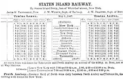 On May 5, 1885, the Perth Amboy Railroad was incorporated in New York to build a 2-mile (3.2 km)-long line connecting the SIRW in Tottenville to Perth Amboy in New Jersey by bridging over the Arthur Kill. The railroad was incorporated with a capital stock of $1 million.[34] This railroad line was never built,[35] and was possibly in interest of the Pennsylvania Railroad. The Perth Amboy Railroad was to be an alternate freight route to avoid congestion at Harsimus Cove and through Elizabeth.[36]: 25