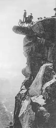 The long horseback ride from Merced remained a deterrent to tourists. Three stagecoach roads were built in the mid-1870s to provide better access; Coulterville Road (June 1874), Big Oak Flat Road (July 1874), and the Wawona Road (July 1875).[42] A road to Glacier Point was completed in 1882 by John Conway, and the Great Sierra Wagon Road was opened in 1883, which roughly followed the Mono Trail to Tuolumne Meadows.[43]