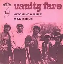 "Hitchin' a Ride" is a song written by Mitch Murray and Peter Callander issued as a single by the English pop/rock band Vanity Fare in late 1969. It reached number 16 on the UK Singles Chart in February 1970 but was a bigger hit in the United States, reaching number 5 on the Hot 100 on June 27, 1970. Billboard ranked the record as the number 14 song of 1970.[2] In Chicago, the record achieved even greater heights, topping the WCFL Big 10 Countdown on 18–25 May 1970,[3] ranking #4 for all of 1970[4] and ranking #12 on rival WLS Radio 89 Hit Parade on 6 July 1970,[5] ranking #10 for all of 1970.[6] "Hitchin' a Ride" sold a million copies in the United States alone, and it became a gold record.[7]