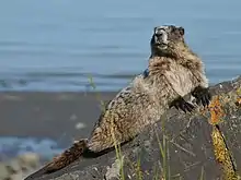 The hoary marmot predominantly inhabits mountainous alpine environments to 2,500 metres (8,200 ft) elevation, although coastal population also occur at or near sea level in British Columbia and Alaska.[5] Hoary marmots occur from southern Washington and central Idaho north, and are found through much of Alaska south of the Yukon River.[13][5] They live above the tree line, at elevations from sea level to 2,500 metres (8,200 ft), depending on latitude, in rocky terrain or alpine meadows dominated by grasses, sedges, herbs, and Krummholz forest patches.[5] Range maps often erroneously depict hoary marmots occurring north of the Yukon River in Alaska, this region is occupied by the Alaska marmot (M. broweri) and not the hoary marmot.[13] Hoary marmots also occur on several islands in Alaska and fossils dating back to the Pleistocene, including some from islands no longer inhabited by the species.[14]