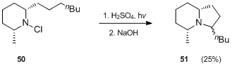 P. E. Sonnet and J. E. Oliver[32] employed classic Hofmann–Löffler–Freytag reaction conditions in the synthesis of potential ant sex pheromone precursors (i.e. octahydroindolizine 51).