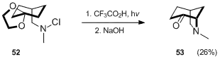 Another example of the construction of a bicyclic amine through the standard Hofmann–Löffler–Freytag methodology is the Waegell's synthesis[33] of azabicyclo[3.2.1]octane derivative 53.