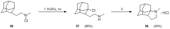Derivatives of adamantane have also been prepared using the Hofmann–Löffler–Freytag reaction.[35] When N-chloroamine 56 was treated with sulfuric acid and heat, 2-adamantanone was formed, but photolysis of 56 in the sulfuric acid-acetic acid mixture, using a low-pressure mercury lamp at 25 °C for 1-hour gave a good yield (85%) of the desired product 57. The cyclization of 57 presented considerable difficulties, but it was finally achieved in 34% yield under forcing conditions (heating at 290 °C for 10 min).