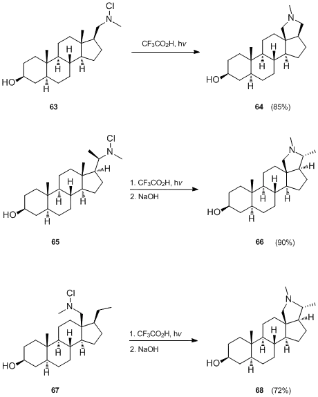 In case of 64 and 66, the five-membered nitrogen ring is formed by attack on the unactivated C-18 methyl group of the precursor (63 or 65, respectively) by a suitably placed nitrogen-centered radical at C-20. The ease of this reaction is due to the fact that in the rigid steroid framework the β-C-18 methyl group and the β-C-20 side chain carrying the nitrogen radical are suitably arranged in space in order to allow the 1,5-hydrogen abstraction to proceed via the six-membered transition state.