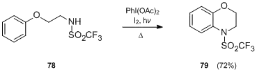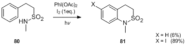 A very interesting transformation is observed when sulfonamides of primary amides bearing an aromatic ring at the γ-position are treated with various iodanes and iodine under the irradiation with a tungsten lamp.[44] The reaction leads to 1,2,3,4-tetrahydroquinoline derivatives and is a good preparative method of six-membered cyclic aromatic amines. For instance, sulfonamide 78 undergoes an intramolecular radical cyclization to afford 79 in relatively good yield.