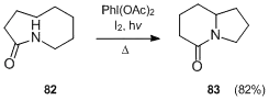E. Suárez et al.[46] reported that the amidyl radical intermediates, produced by photolysis of medium-sized lactams, e.g. 82 in the presence of PhI(OAc)2 and iodine, undergo transannular hydrogen abstraction to afford intramolecularly funcionalized compounds such as oxoindolizidines 83.
