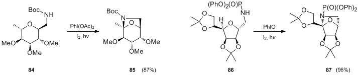 E. Suárez and co-workers[27] also applied their methodology in the synthesis of chiral 8-oxa-6-azabicyclo[3.2.1]-octane 85 and 7-oxa-2-azabicyclo[2.2.1]heptane 87 ring systems. This reaction can be considered to be an intramolecular N-glycosidation that goes through an intramolecular 1,5-hydrogen abstraction promoted by an N-amido radical followed by oxidation of the transient C-radical intermediate to an oxycarbenium ion, which is subsequently trapped by an internal nucleophile.