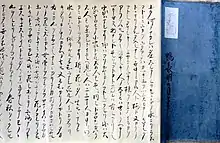 Unusually for works of the period, Chōmei's original manuscript survives. Numerous copies have been made and circulated, some complete and some abridged. The complete editions are further categorized into old and popular, while the abridge editions are categorized into Chōkyō, Entoku, and Mana. The Chōkyō and Entoku editions are named after the era date in the afterword and both include extra passages. The Mana editions are written entirely in kanji replacing the kana in the kohon editions.[33]