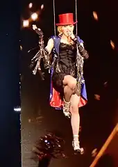 On April 9, 2015, Madonna appeared on The Tonight Show Starring Jimmy Fallon and sang "Holiday" using classroom instruments, alongside American band The Roots and host Jimmy Fallon.[116] That same year, it was performed as the final song of the Rebel Heart Tour: The singer wore a red, white and blue Americana-themed costume, and draped herself in an American Flag.[117] She "strutted across the catwalk" while the dancers, who were dressed "Gatsby-style", danced and paraded with "jubilant relief".[118][119] The number ended with Madonna being strapped onto a harness and "flown offstage like Peter Pan".[120][121] The performance was deemed a "triumphant" encore by The Arizona Republic's Ed Maseley.[121] By contrast, Joey DiGuglielmo from the Washington Blade deemed it anti-climactic.[122] The performance at the March 19–20, 2016 shows in Sydney's Allphones Arena was recorded and released in Madonna's fifth live album, Rebel Heart Tour (2017).[123] An acoustic "Holiday" was the final song of the 2016 Madonna: Tears of a Clown show: the singer wore a clown's costume and played ukelele.[124] In Miami, a fan got the chance to hold the microphone while she sang.[125]