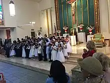The Holy Family Catholic Church is a Catholic church located in Artesia, California. Established in 1930, it holds masses in English, Spanish, Portuguese, and Mandarin Chinese.[1] It is named after the Holy Family of Jesus and is a part of the San Pedro Pastoral Region in the Archdiocese of Los Angeles. The church also contains a school, Our Lady of Fatima (OLF), named after one of Mary, mother of Jesus' titles.[1] As of 2014, it has over 15,000 active parish members[3] and 80% of the mass attendees are Filipino as of 2019.[2] Rev. John Ernesto Ma. Cordero is the current pastor.[5] Its logo reads "Go, Therefore, and Make Disciples of All Nations...," quoting Matthew 28:19.