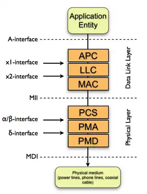 The interface between the Application Entity and the Data Link Layer is called A-interface. The interface between the Data Link Layer and the physical layer is called Medium Independent Interface (MII). The interface between the physical layer and the actual transmission medium is called Medium Dependent Interface (MDI).