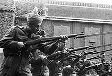 By the end of 1940, the Home Guard was established into 1,200 battalions, 5,000 companies and 25,000 platoons.[11] For its primary defensive role, each section was trained and equipped to operate as a single, largely independent 'battle platoon', with an operational establishment of between 25 and 30 men at any one time although, as volunteers would also have full-time jobs, the numbers of volunteers in each section would be around twice that establishment. In the event of an invasion, the Home Guard battle platoons in a town would be under the overall control of an Army military commander and maintain contact with that commander with a designated 'runner' (no Home Guard units were issued with wireless sets until 1942), who would usually be a motorbike owner. Otherwise, the battle platoon was static and would defend a defined local area and report on enemy activity in that area, but it was neither equipped nor expected to join up with the mobile forces of the regular army. Each Home Guard unit would establish and prepare a local strongpoint, from which 'civilians' (non-Home Guard) would be cleared if possible, and aim to defend that strongpoint for as long as possible. It might be forced to retreat towards a neighbouring strongpoint but would not surrender so long as ammunition held out. Most towns of any size would have a number such Home Guard units, each defending its own strongpoint and providing 'defence in depth', which should ideally be sited to offer supporting fire to cover one another and to control road access through the town from all directions.