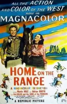Home on the Range is a 1946 American Western film directed by R. G. Springsteen and written by Betty Burbridge. The film stars Monte Hale, Lorna Gray, Bob Nolan, Tom Chatterton, Robert Blake and LeRoy Mason. The film was released on April 18, 1946, by Republic Pictures.[1][2][3]