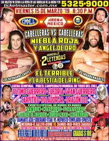 The storyline that led to the main event of the 2019 Homenaje a Dos Leyendas show started during the 2019 Universal Championship tournament. Both Niebla Roja and El Terrible won their tournament block and faced off in the finals on February 15, 2019. For the match Niebla Roja had his brother, Ángel de Oro, in his corner while La Bestia del Ring from Los Ingobernables accompanied Terrible for the match. During the match La Bestia helped El Terrible defeat Niebla Roja, leaving to all four wrestlers fighting after the match.[6] On February 19 it was announced that Los Hermanos Chavez (Ángel and Roja) would face El Terrible and La Bestia del Ring in the main event of the 2019 Homenaje a Dos Leyendas show, where both teams would "bet" their hair in a Lucha de Apuestas match.[1]