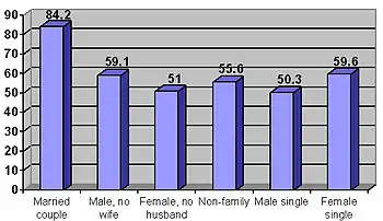 There is a strong correlation between the type and age of a household's family structure and homeownership.[24] As of 2006, married couple families, which also have the highest median income of any household type, were most likely to own a home. Age played a significant role as well with homeownership increasing with the age of the householder until age 65, when a slight decrease becomes visible. While only 43% of households with a householder under the age of thirty-five owned a home, 81.6% of those with a householder between the ages of 55 and 64 did.[24]