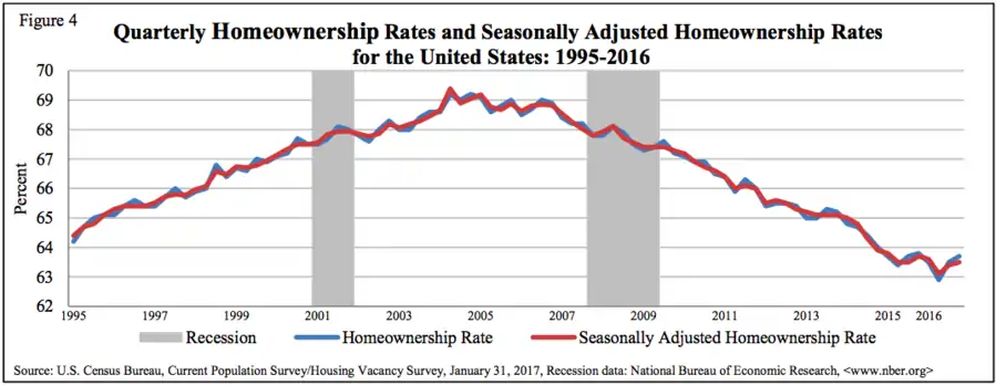 - ↑ "US Census Bureau, homeownership rate by area". Census.gov. Retrieved October 24, 2016.