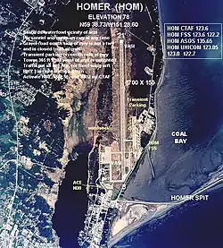 Homer Airport (IATA: HOM, ICAO: PAHO, FAA LID: HOM) is a state-owned public-use airport located two nautical miles (4 km) east of the central business district of Homer,[1] a town in the Kenai Peninsula Borough of the U.S. state of Alaska.