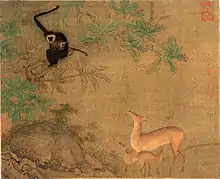 - Sānyuán - In the eleventh century in the Northern Song Dynasty men who scored first in all three levels of the civil service examination were distinguished with the title "Sanyuan" (三元) meaning simply "three firsts." Immediately following the appearance of this term in Chinese literature, the motif of the three gibbons pursuing egrets appears in Chinese painting. In Chinese the scene could be described as "三猿得鷺" (sǎn yuán dé lù) a pun on "三元得路" (also sǎn yuán dé lù) meaning "a triple-first gains one power." Soon, the gibbon became a more generalized symbol, praising those who participated in the civil service exam regardless of whether they achieved three firsts. Thus, the image expresses a wish that its recipient do well on his exams and become successful. Later a variation on the gibbons and egret motif appears through the substitution of deer for egrets. In mandarin the word "鹿" (lù), meaning deer, is homophonous with "鷺" (lù), meaning egret, and so the image achieves the same pun.[23]