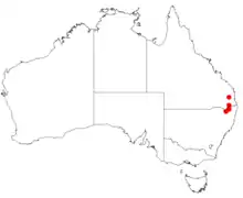 Only found in a single population in Torrington district and locations in Boonoo Boonoo and Basket Swamp National Parks north east of Tenterfield New South Wales. Grows in heath on shallow sandy soils on and around granite outcrops.[4]