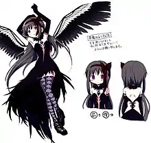 Ume Aoki designed Homura.[1] Urobuchi chose the character's purple color motif, and Aoki designed it according to him.[11] Aoki tried to let Homura "shine through in her design", and said that her "silky long hair" is the most distinguishing part of her design. When designing the character for her magical girl outfit, Aoki kept Homura's "personality and combat style in mind" and immediately found her a fascinating character. She described Homura's magical girl design as "rather monochromatic". For the school uniform, she had Homura wear black tights that provide the same feeling as her magical girl outfit, and said the character "gives off the air of a silent beauty".[11] The anime staff designed Homura's weapons, while her bow, used in the final episode, is based on an illustration drawn by Ume Aoki.[12] Urobuchi did not originally write the pair of black wings Homura sprouts in the series' final episode in the script. Production designers Gekidan Inu Curry added this detail. Urobuchi was happy with the addition as it added more "mystery and depth" to the character.[6]