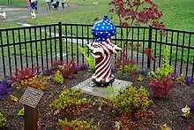 The park also features two former fire hydrants donated by Clean Water Services and painted by a local dog association.[3] One hydrant is decorated with cartoon dog characters, while the other is painted with an American flag and known as the "Hondo Memorial Hydrant".[3] The hydrant with the American flag is a memorial to the namesake of the park and is situated atop an 18-inch (460 mm) base. Within a week of opening officials removed the hydrant painted as an American flag over concerns of disrespect for the flag if dogs used the hydrant,[5] but it was later returned and fenced off to prevent such incidents.[6] The controversy over the flag painted hydrant received international news.[7][8][9]