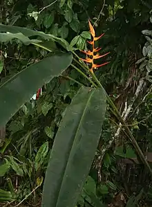 The Honduran white bat is one of approximately 22 known species of bats that roost within leaf "tents".[16] The Honduran white bat cuts the side veins extending out from the midrib of the large leaves of the Heliconia plant causing them to fold down to form a tent. Tents are likely constructed by multiple individuals; females have been observed constructing tents, but it is likely that males do so as well.[17] New tents are constructed throughout the year, as modifying the leaves into tents causes the leaves to die. Once modified into a tent, a leaf lives approximately 7.5 weeks, compared to 61 weeks in an unmodified leaf.[18] Several species of Heliconia are used as roosts, including H. imbricata, H. latispatha, H. pogonantha, H. tortuosa, and H. sarapiquensis.[10] Rarely, it has been documented using Calathea and Ischnosiphon inflatus plants as roosts. In selecting leaves to turn into tents, it appears that the age and size of the leaf is more important than the species of plant.[19] Preferred leaves are 0.8–1.2 m (2.6–3.9 ft) long and less than 30 days old. Younger leaves may be preferred because they are easier to bite through and shape than older leaves. It also prefers leaves that are less than 2 m (6.6 ft) above the forest floor. Preferred leaves are in areas of low understory vegetation density, but high canopy vegetation density. Heliconia density is lower surrounding chosen leaves than would be expected if the bats selected leaves randomly. Features such as canopy density may help the tent maintain a consistent microclimate. Tents are usually 23.3 °C (73.9 °F), with little fluctuation. High canopy density could also protect its tent from disturbance from wind and rain. Because tent construction takes up to several weeks' worth of time from several individuals, choosing more sheltered tents could prolong the life of a tent and protect the bats' investment. Low understory vegetation density is thought to be beneficial by providing an uncluttered airspace for the bats as they exit and enter their tents.[16]