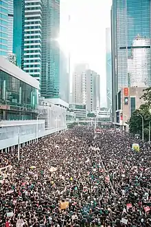 Several mass protests took place during mid 2019 against a proposed extradition bill allowing dissidents to be arbitrarily transferred to mainland China, including a march claimed by organisers to have included two million people, a quarter of Hong Kong's population, on 16 June.[47] Throughout the summer and autumn, clashes between police and protesters occurred. Tolerance for differing opinions on the protests reportedly decreased in Hong Kong.[48] Due to the outbreak of the COVID-19 pandemic, mass protests were suspended from early February 2020. The resurgence of protests after the easing of the pandemic was brief, due to the national security law. Sporadic protests still took place afterwards, in spite of the draconian nature of the law.
