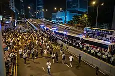 Hundreds of protesters camped in front of the government headquarters well into the night, with more joining them in response to calls from Demosistō and pro-independence activists. Police formed a human chain to prevent protesters from entering Harcourt Road, the main road next to government headquarters, while Special Tactical Squad (STS) stood by for potential conflicts.[73] Although the CHRF officially had called an end to the march at 10 pm, around 100 protesters remained at the Civic Square.[74]