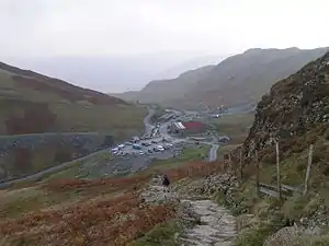 Honister Pass is a mountain pass in the Lake District in Cumbria, England. It is located on the B5289 road, linking Seatoller, in the valley of Borrowdale, to Gatesgarth at the southern end of Buttermere. The pass reaches an altitude of 1,167 feet (356 m), making it one of the highest in the region, and also one of the steepest, with gradients of up to 1-in-4 (25%).[1] The saddle at the watershed is known as Honister Hause, using the Cumbrian word hause for such a feature.