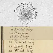 The hill has had various names throughout the years. In Spanish, it was called Cerro de Paja ó Pan de Azucar, meaning "hill of straw", "sugar bread", or "sugarloaf".[5][6] Sugarloaf refers to refined sugar shaped into a tall conical form, which was sold before the 1900s. Hooiberg is one of several formations named after Cerro Pan de Azucar (such as Pan de Azucar Island in the Philippines or Sugarloaf Mountain in Brazil). The Dutch gave it their own name, and the spelling of Hooiberg has changed over time, appearing as Hooy berg and Hooij-berg.[7][8] The name itself is a combonation of hooi, meaning "hay", and berg, meaning "mountain", "mound" or "pile".[9] The hill is said to resemble a loose haystack or a hay barrack (Dutch barn), which explains the name Hooiberg.[10][11]