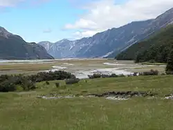 The Hopkins River (Māori: Te Awa Aruhe)[2][3] is in the central South Island of New Zealand.[4] It flows south for 45 kilometres (28 mi) from the Southern Alps / Kā Tiritiri o te Moana into the northern end of Lake Ōhau in the Mackenzie Country.[5]