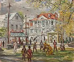 Day's introduction to the Carolina Lowcountry in 1936 occurred at the height of the artistic movement now known as the Charleston Renaissance.[22] Over the next 50 years, Day carried this tradition into the late 20th century with works such as Athenian Room I (ca. 1980) and Kaye’s Drug Store, King Street, Charleston, SC (ca. 1980), depicting meeting places central to the daily lives of Charlestonians.[20]
