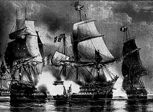 In August 1782, Nelson had a narrow escape from a far superior French force under Louis-Philippe de Vaudreuil, only evading them after a prolonged chase.[58] Nelson arrived at Quebec on 18 September.[59] He sailed again as part of the escort for a convoy to New York. He arrived in mid-November and reported to Admiral Samuel Hood, commander of the New York station.[60] At Nelson's request, Hood transferred him to his fleet and Albemarle sailed in company with Hood, bound for the West Indies.[61] On their arrival, the British fleet took up position off Jamaica to await the arrival of de Vaudreuil's force. Nelson and the Albemarle were ordered to scout the numerous passages for signs of the enemy, but it became clear by early 1783 that the French had eluded Hood.[62]