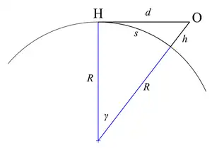 Another relationship involves the great-circle distance s along the arc over the curved surface of the Earth to the horizon; this is more directly comparable to the geographical distance on a map.