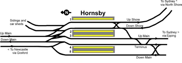 On 1 January 1890, Hornsby became a junction station with the opening of the North Shore line to St Leonards. In 1894, a third platform was built along with a locomotive depot to the east of the station.[4] Hornsby was the northern extremity of the electrified network from 1930 until it was extended to Gosford in 1960. The wires did continue north of the station as far as the Hornsby Maintenance Depot.